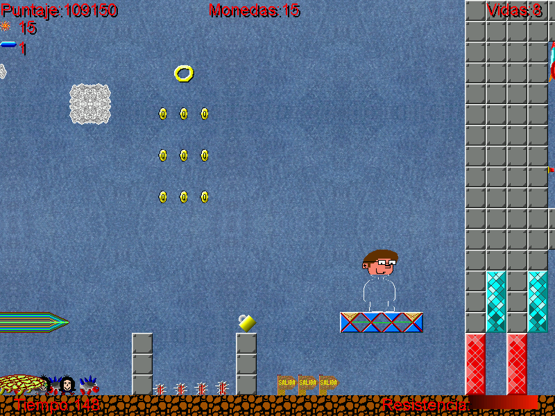 El juego contiene unos 40 niveles total, más o menos unos 30 en el modo historia normal y unos más al final de yapa (Los normales los hizo prácticamente todos mi hermano y son sensatos mientras que los de yapa los hice yo y no tienen ningún sentido), y 4 dificultades. Además los niveles están clasificados entre distintos mundos que el protagonista va atravesando en sucesión uno tras otro (cada mundo tiene su propia ambientación en cuanto a estilo del nivel y de gráficos): 'Clásico', Bosque, Playa, Barcos, Cuevas de lava.